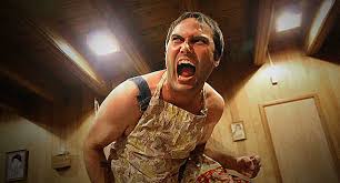 Furthermore, once certain revelations are made known to us, the credibility relies on two or three characters that turn out to be key to the whole situation. Sadly they end up playing their respective parts like carbon copies of similar stereotypes from other films in the genre, just not as well. The story-time aspect in the beginning carries onto labeling characters names, and every area of the production set as well as the cabin tour, that got tedious after a while. It’s not long into the film and the cast arrive at the cabin, I didn’t catch how they got wind of the place, or if they knew the owner, but any who. Upon arrival, a mysterious man carrying a pitchfork and wearing a wheat bag over his head starts to walk towards their cars. Weird? yes a little, but not overly scary or suspenseful given it’s like 2pm in the afternoon (haha). Here’s me thinking it would take your brain a few seconds to work out what you were actually seeing, but apparently not because without warning several members of the group begin frantically screaming and freaking out before they realize it’s just a harmless, somewhat simple man. In fact, it’s the owner of the cabin’s son. Once the proverbial shit hits the fan you’d think that would be the time to try to obtain a weapon, but alas no one ever does. I can take a weak moment or two throughout a film in this genre, with this title, but c’mon (haha). You don’t want to insult your viewers intelligence to that extent. They expect a fight of some sort and not a single one of these try-hards even has a crack, of course making them even less likable. A character that shall remain unnamed, tries to dial for help at one point but is in plain view of the rest of the group and clearly not dialing. Yet even with eyes on her no one seems to notice the numbers aren’t rotating (ah durr..). On another occasion a couple of characters are hiding behind a couch trying to concoct a plan. They are about 6 foot from the Pizza girl and don’t appear to be feeling the heat, Seriously like you wouldn’t be skewered in 4 seconds? I know they were probably trying to build some suspense in that part, but it was just “Scary Movie” silly. I could go on with these gripes but I won’t.