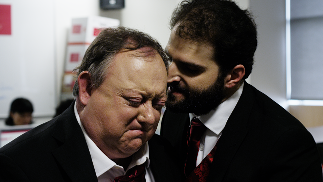 On the technical front, my only complaint was that the film was a little flat color wise. The subject matter is dark in nature but other than some Giallo inspired lighting, most of the saturation is dull. The score is unorthodox and quirky in its timing and that’s one of the best parts about it, though it is slightly heavy-handed in sections that don’t really require it. Now it may have been intended, but some of Regan’s writing felt rather juvenile. There’s some clumsy dialogue during several conversations and plenty of excess profanity too. Language doesn’t normally bother me if it fits the tone, but there’s at least two or three c-bombs in here that were crass for crass sake. Some of the secondary actors like David Curtis and Dan Palmer, who play Stiles office “cronies” (for lack of a better word), fall short during their spiel to Clyde (played by Harvey) in the bathroom scenes. Banjo was shot in the UK but features three characters (Ronnie included) that are all Americans. Morter is English himself but plays Ronnie with an American accent. I know Clay is actually American and I’m not sure about Vito, it was just an odd detail I noticed. Because of the films fantastical nature, there were scenes that I thought for sure were in Peltzer’s head and turned out not to be. Example number one. Banjo opens with Peltzer and Deetz having what can only be described as the least enjoyable sex scene perhaps anyone’s ever had in film history. Deetz voicing her displeasure and frustration with the stale relationship and her mans erectile dysfunction. It quickly escalates from there to action (and not the good kind), as she proceeds to empty a full condom of semen onto Peltzer’s face (and now I’m scarred for life). So you can see how I thought that was just a dream right? Or more aptly, a nightmare.
