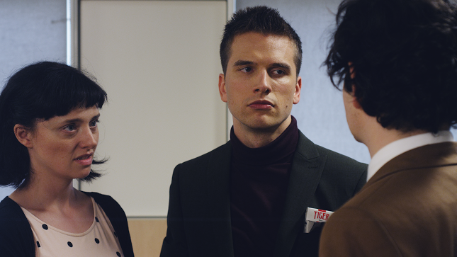 Let’s talk about the cast. Leading from the front is James Morton, he does a nice job of conveying the psychological damage to Peltzer, after having suffered long-term at the hands of his co-workers. Then there’s Thompson, playing Deetz, the love of Peltzer’s life. It’s clear from the immediate introduction to Thompson’s character mid intercourse, that she’s curvaceous and sexy as hell. Simply put, she’s stacked. More or less on display, and looking great. Deetz is very much a self involved and openly blunt woman whom Peltzer’s constantly pinching himself over because he can’t believe he landed her. She’s clearly stunning but a nymphomaniac at her core, and truly ugly on the inside (which I’m sure Dani is not). Thompson’s performance is a little over dramatic but it fits with Deetz’s particular brand of brazen. The only other key actress in the film is Gardner, playing Melissa, an old flame of Peltzer’s who works in the same office but is now in a relationship with corporate bully, Stiles Rembrandt (Carlowitz). Serena doesn’t get a lot of material but she’s serviceable and Carlowitz plays that guy you love to hate, though on a couple of occasions his performance is a little over the top. The same can be said about Trigo, who plays the boss, Mr Sawyer. He’s the biggest bully of them all but there’s several of Trigo’s reactions that feel cartoonish (maybe due to the writing) and therefore he’s probably the most inconsistent of the leads. It was great to see Regan land a familiar name in, Laurence Harvey. Thanks to Tom Six (Writer/Director of The Human Centipede) you feel like everyone knows about Harvey, so it was different seeing him portray the victim, finding himself on the receiving end of the wrath instead of dishing it out (a much less violent wrath than THC of course).