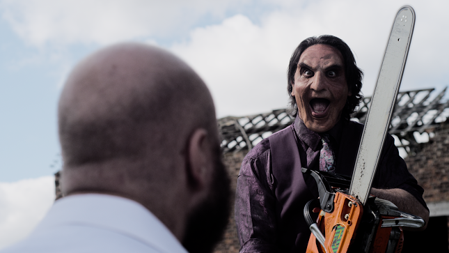 Damian Morter’s, Ronnie, is by far in a way the best thing about Banjo. Regan’s writing is strongest once it becomes about the imaginary friend, and in turn the dark side of Peltzer’s psyche. You don’t learn much about Ronnie’s origin but the character is enjoyable enough despite it. Morter’s character’s makeup bears a striking resemblance to the facial structure of late actor, Robert Z’Dar (from Maniac Cop). Ronnie’s face is swollen and the overly large jaw gives him a very specific and unsettling look. Damian’s portrayal of this darkly funny presence is like a much zanier, Christian Bale, or should I say Bale playing “Pat Bateman” (yet another American Psycho reference). It may be completely coincidental that I found AP qualities in Regan’s film but it’s fun all the same. Morter is constantly animated with his movement and facial expressions and it makes most of his scenes very entertaining. Banjo doesn’t shy away from making plenty of mess with the red stuff either. There’s ample amount of blood spray, most notably during an agonizing situation Peltzer finds himself in that this viewer can really relate to (at least the fear of it on some level). The same scene displays a very authentic prosthetic piece that’s bound to make you look away at least once and cringe more than that. The standout kill in Banjo is one that involves a chainsaw and a custom three-quarter body cast, impressive stuff on limited funds!