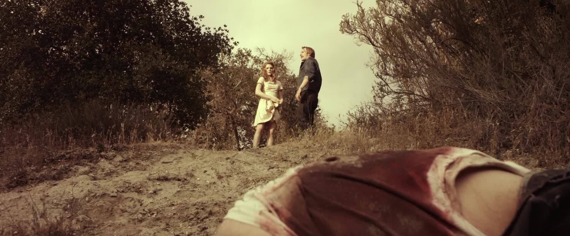My only technical issue is to do with the volume of the music during the car chase in the beginning of the film. It’s clearly too loud and even with Hebert and Villar’s characters yelling at each other in a panic, you can’t make out much of what they’re saying. As far as the story content goes, it’s not without its flaws (plausibility wise) and continuity issues. In the opening scene we see a man (played by Graham Skipper) being hunted by our ex-military mad man. Shots are fired from one direction and the man hits the ground, in the very next frame the shooter is seen approaching from a completely different angle as to where the shot originally came from. I suppose there’s an argument that with it being partially a slow-motion sequence, maybe he’s taken a specific route and come around a different way (not too sure). From the outset, Carnage Park definitely foreshadows some things to come but that’s almost unavoidable with a film of this nature. For example, the opening with Wyatt’s monologue probably should have been presented as off-screen narration. It’s displayed to the audience like he’s speaking to someone in frame, which I guess he is in a way, if you consider the man in the distance. Although, he finishes his dialogue before we even know he’s hunting someone, so that’s a little misleading.