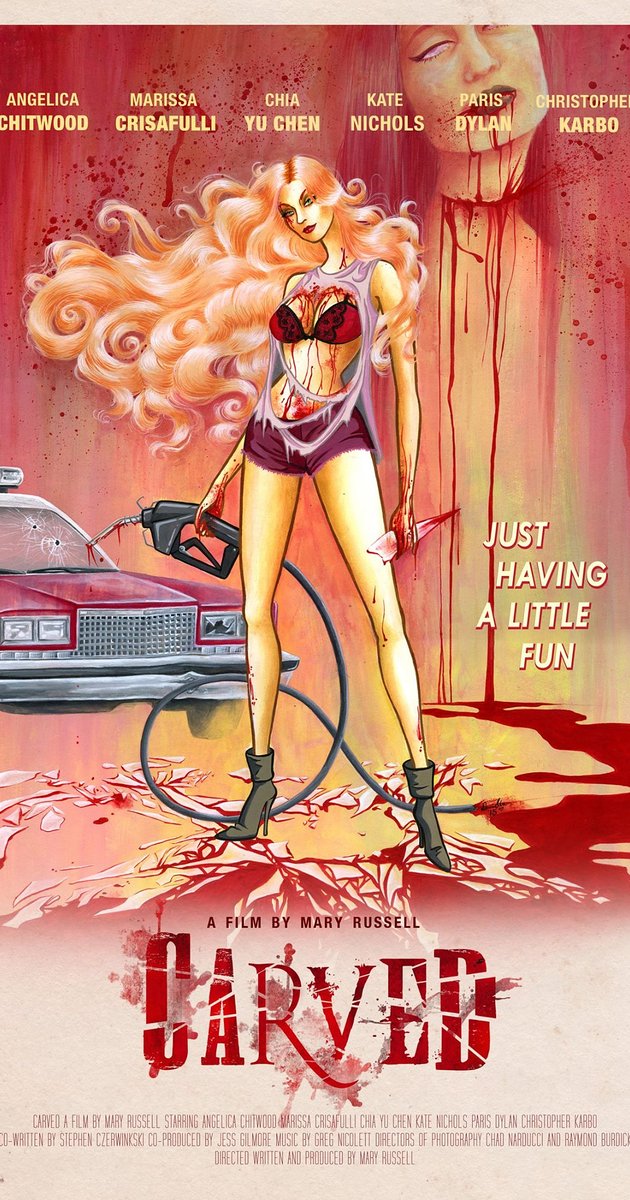 Carved makes for a nice introduction to the works of Mary Russell, I was entertained for its duration. I love the poster art and the script definitely has a hint of Stephen King’s “Desperation” meets “The Hitcher” about it. It’s well shot, the score works and the stylistic lighting helps make for an atmospheric little thriller. There’s pretty girls and some nice blood flow, even if the direction of it all is somewhat expected. Some more attention to detail on the technical front would have just tidied up what’s already a solid product. Odd weak moment aside, it serves its purpose and I’d definitely recommend this to fans of the genre! You can check it out at the link below, Enjoy!