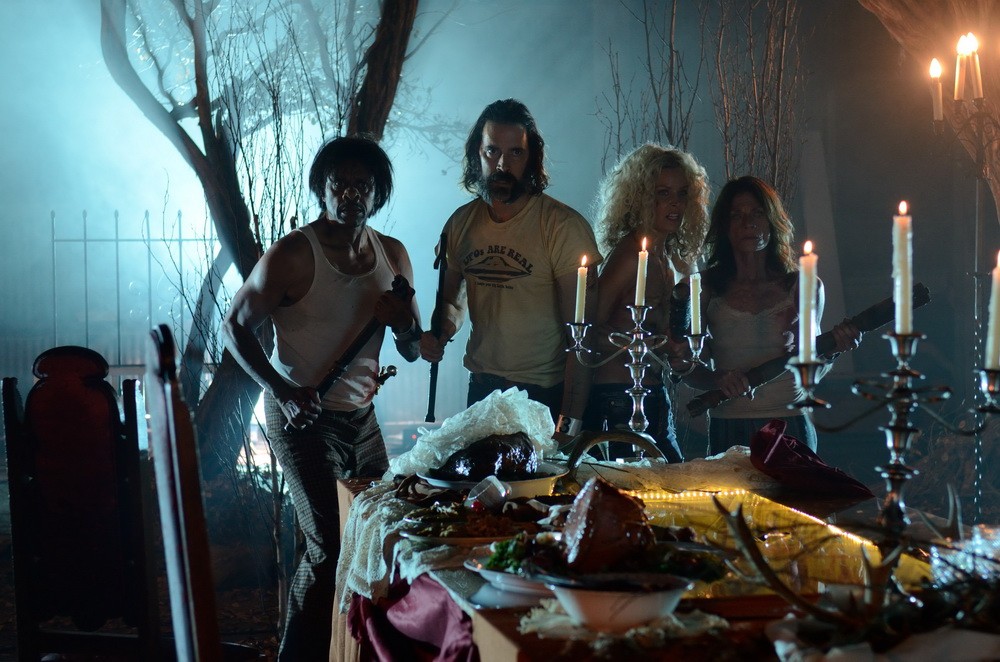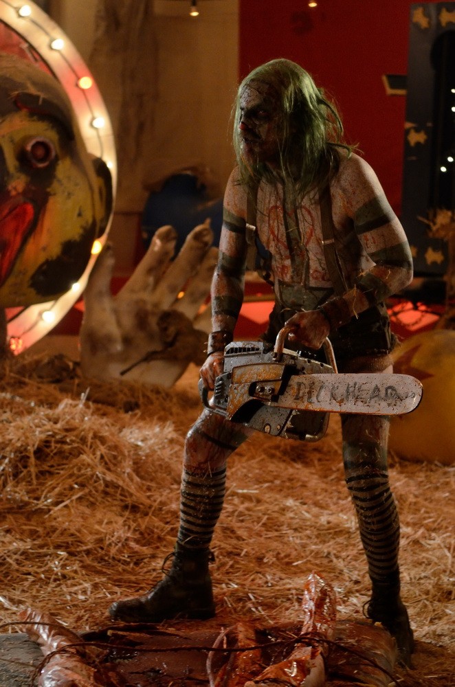 I know we’re all inspired by something, but it pays to breathe some of your own creativity into your writing (I’m not saying that’s easy). I understand that it’s a difficult thing to do, especially if you’re exposed to a lot of films, but if there’s not even a trace of it then what you end up with is just a rehash of formulaic clichés. Slasher fans aren’t usually that hard to please (well most of us) but when Jones unfortunately lifts enough of a scene from Rob Zombie’s “Halloween” to raise a red flag, it’s hard for a reviewer to ignore it. Other questionable particulars occur, such as a muzzle like contraption covering Colin’s face, (Hannibal Lector eat your heart out) then his placed in an asylum/institute of which you just know he’s just going to break out of. Then head of the facility, Sybil Shaw (Perkins) walks us through the dangerous criminals they house, throw in a trio of hapless and childish security guards making bets and you’ve got yourself a scene from Halloween (more or less). Come to think of it, “The Funhouse Massacre” begins in almost the same fashion (though it had to be that way for the origin of the story to work). The dialogue between said guards during those scenes is predictable and immature, fortunately it gets a little better as the story picks up with Alex and Co. Speaking of dialogue, Perkins is guilty of momentarily pausing a few times during her early scenes, as if she’s thinking about her lines prior to actually saying them. There’s more than a handful of specifics here that don’t add up either. For example, Sybil claims that the facility holds all the worst serial killers from around the world, yet we’re told that Colin only killed five people. I’m not sure if that classifies the worst of the worst but okay, I can swallow that part. So these guys are dangerous then? The most dangerous psychopaths you can get, right? Well okay then, one might ask why the rooms clearly have wooden doors attached to them. It probably wasn’t a great decision to show those four or five wooden doors being opened by guards for guests to take a gander inside, especially because the other prisoners have no real bearing on Colin escaping (he would have anyways). Bringing me to my next question, How was he able to get free from the restraints in the first place? I guess the same way Michael Myers did. You don’t actually get to see Colin escape, it’s one of those times they conveniently cut to an irrelevant conversation instead, and later return to the old body switcharoo. I would’ve loved a more realistic approach in order to move that part of the story forward. It’s also established quite early on that Adam comes from a military background, though when it comes to his combat skills you wouldn’t know it. He’s less than useless. He gets his ass beat numerous times by The Wicked One, so I’m not sure about that one.