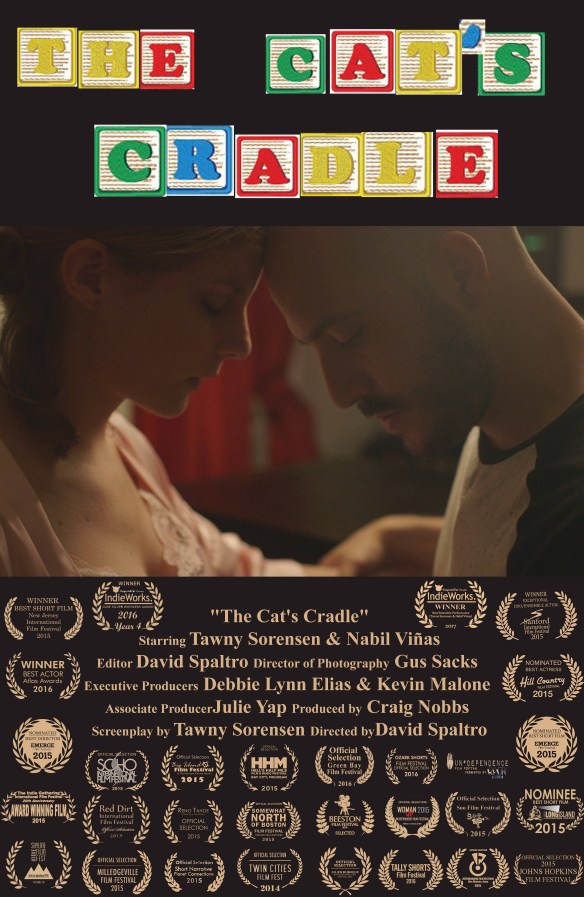 Firstly, I’d just like to say thank you to Actor/Writer, Tawny Sorensen for allowing me early access to an online screener of her 15 minute, Drama short “Cat’s Cradle”, Directed by David Spaltro. Cat’s Cradle focuses on young adult couple, Amy and Jim (played by Sorensen and Nabil Vinas) who’ve been luckless so far in their attempt to conceive. With Jim’s regimented nights for the two always pre planned, a crisis of self-identification arises along with certain truths that threaten the couple’s core foundation. It doesn’t happen all that often, but every now and again I open my email to find random screeners that have been sent in for review, as was the case with Tawny’s debut short.
