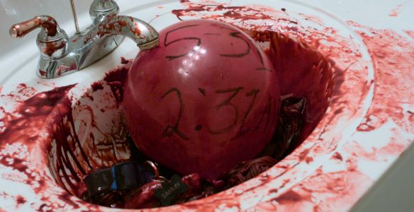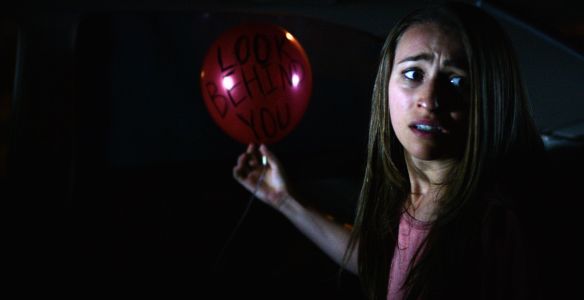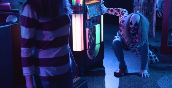 I’m digging the artwork despite the fact that the clown image doesn’t correspond with the look of our villain. It’s a simple but threatening figure at the forefront and an old style font used for the title, though I’m not sure why it is that indie films use misleading imagery (to be fair I think it’s the distributors who are at fault). Taking into account the film’s low-budget, Chaz Olivier’s cinematography is generally quite good and the audio track is clean. Most of his framing is neat and there’s a great jib shot (crane) across a driveway and onto the street as Ken’s daughter (played by Caitlin Rigney) drives away at the beginning of the film. I liked a lot of the establishing shots as well, particularly the externals of both Ken’s house and Emma/Heather’s. That said, almost the entire film feels like it’s been done handheld, via a Steadicam, and consequently it doesn’t feel as cinematic as it could have. The lighting was another characteristic that was really well conceived. Most notably during a sequence that sees Emma’s work colleague and friend, Jonah (Murray) navigating a hallway and its surrounding rooms. The scene is back-lit with reds, greens and blues and it looks gorgeous. Kris Bendrick composed a simple but effective bass orientated score, adding a nice mix of strident synth notes, to boot. Even some of the sound design worked well, like the scratching of balloons and carnival clatter.