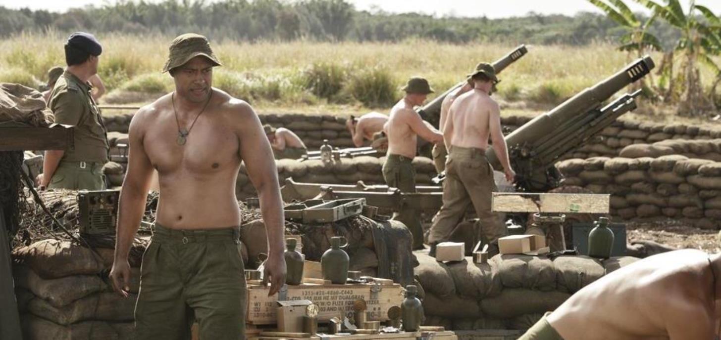 The supremely clean nature of Ben Nott’s (Predestination) cinematography is something to behold. It’s categorically on show from the opening framing, all the way through to a notable tracking shot which pulls in low over a bed of water and rises up to show D company (and co) searching the area for survivors – a gorgeous movement indeed. The drone footage looks nice, two-shots are tight, and the best is kept for a stunning crane shot with a timely lens flare through the luscious green trees and down into some calm marshy terrain. The audio track and foley are both palpable, and with full surround sound you won’t get a more accurate sense of the environment, and in particular, the unfathomable volume of penetration dispersed by the heavy artillery (which was by all accounts ear-shattering). Caitlin Yeo is behind the aptly haunting score in Danger Close. It’s one that sees its foundations settled in low-end tones and stirring vocal work. That said, there’s still some energy in here with Nancy Sinatra’s “These Boots Were Made For Walking”. Attention to detail is strong in both Lizzy Gardiner’s costume design and Sam Hobbs production design. The other aspect where good continuity is maintained throughout is the hair and makeup. Everyone looks fittingly worn and disheveled by the elements and the demands of the situation at hand.