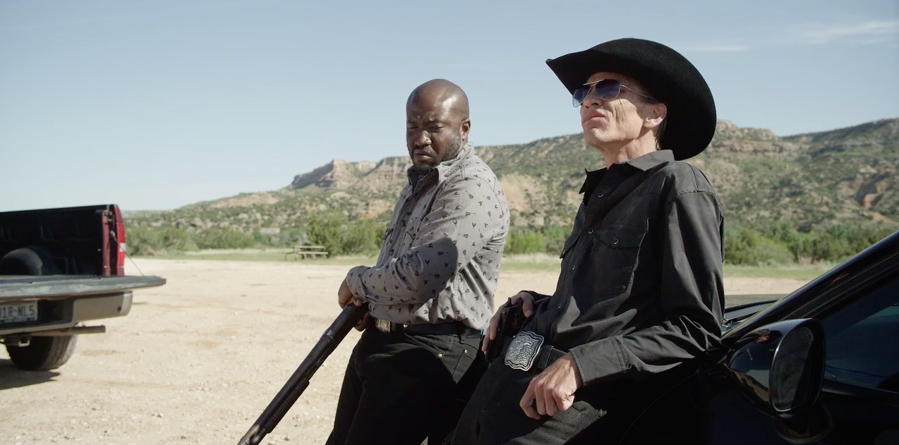 After having seen three or four Texas-based films back to back, I get the feeling that whole setting is automatically going to get me on board anything Circus Wheel Productions puts out in the future. As it is I’m a pretty big fan of Western’s and there’s no better place to shoot them than in Texas. Once again Bentman delivers on high production value, making the most of minimal locations and a few recognizable faces. Both the audio track and dialogue are nice and clear. The cinematography in each of Brett’s films has been a cut above what I’m used to seeing in the world of independent film (at least outside the confines of horror). Michael Ray Lewis was the DP (director of photography) on both of Brett’s previous films so I was surprised to see Travis Jones taking the reigns here. I wasn’t sure how another set of eyes would affect the aesthetics, but that was quickly put to bed after a series of gorgeous aerial shots over the Texas plains, not to mention a number of other wonderful establishing shots of property fence lines, fields of hay and bare highways. Everything is nicely framed and the clever focus pulls and zooming techniques scream professionalism. My favourite sequence of shots sees the lens aimed up from the dirt, focusing on Grady and his right hand man Slopes (Derrico Thomas) as they’re tracking Kreep. I was looking forward to hearing what type of score Brett might have opted for here, especially considering this has more of a western vibe than anything else. There’s plenty of that complementary acoustic blues guitar, but it’s the inclusion of both banjo and mandolin that help give it a slightly different feel. Some effective violin strokes are also thrown into the mix during some of the more suspenseful moments.