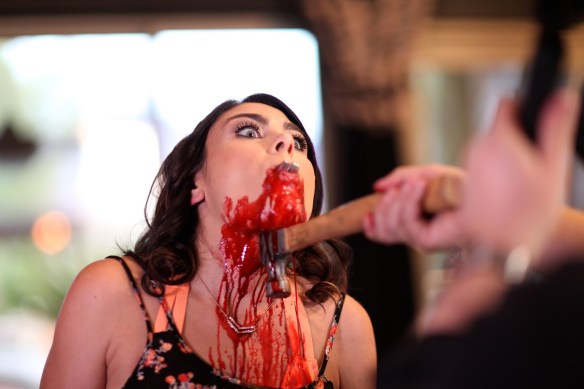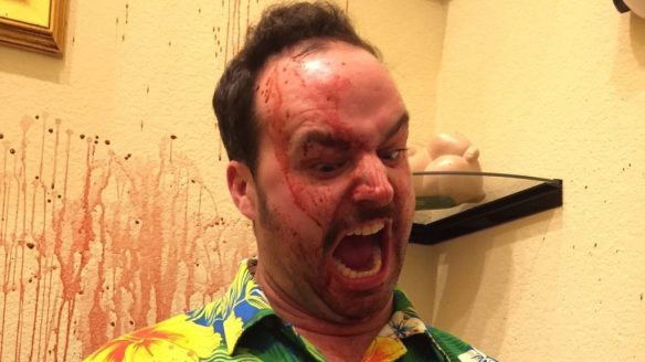 Like all low-budget undertakings, there’s a learning curve and not everything goes swimmingly. Marvick’s film has some patches of obvious ADR (additional dialogue recording) intertwined with the on set audio, which is sort of par for the course on a small independent shoot, but given this takes place in primarily one location with little noise from outside distractions, I wouldn’t have thought it was needed. The only time the score felt a little heavy-handed was during a spate of dialogue between Blair and Danny (I think it was?), I think it could have been pulled back in the mix. In hindsight, I would’ve loved to have seen Drew get “Pool Party” from The Aquabats into the film’s soundtrack as well. There’s a handful of small continuity issues scattered throughout the film, some standing out more than others. The color and consistency of the blood changes a few times, usually looking better in the aftermath and more pink and watery during the kills themselves. Blood is a tough one to get one hundred percent right and it needed some more work. The pool that’s being cleaned in the beginning probably could have had some more debris put in it to make the cleaning of it more believable. During the same scene there’s an establishing shot showing an empty backyard and a clean pool, yet seconds later Mrs Stevens is sunbathing poolside with no actual lead in. Drew could have had her exit a sliding glass door and walk over to the beach chair just to help keep the continuity in order. In a later scene, Nancy runs back into the same room she originally left after an altercation, you’d think she’d remember not to go back in there (although that could be an inside joke poking fun of the horror movie clichés, and there’s every chance it was). Neme can also be seen breaking character and almost laughing during the scene that precedes that one. I thought the dialogue in the second half was grounded more in comedy than horror and it didn’t really work for mine. The writing becomes a bit crude for my taste, going a little far sexually for the overall tone of the movie. The girls are guilty of some unnecessary excessive profanity, particularly Tiffany (although that falls on the writing). A couple of scenes start off funny but become tedious fast. Clay’s “Ferris Bueller” theory takes up what feels like five or six minutes of screen time and the masturbation scene was just awkward (probably the intention though). Clay became too much for me in the end and I wanted to see him swiftly dealt with.