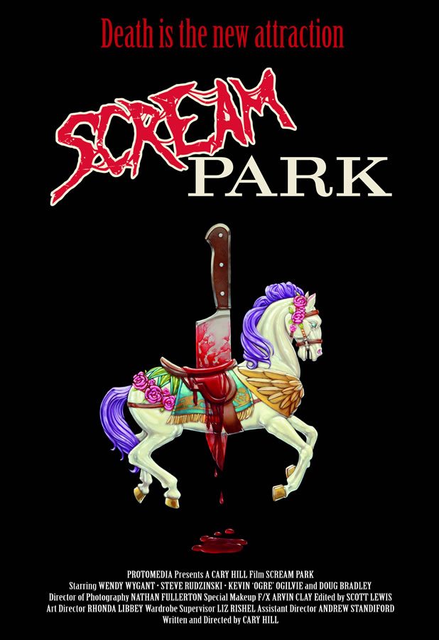 Firstly, I would like to thank Cary Hill, the director of the low-budget slasher flick “Scream Park”, for sending me a screener of the film to watch before its official release date. Scream Park is a story about a group of young teens who work at a local amusement park called Fright Land. The park is failing to generate any buzz and it’s lacking income. It becomes evident to everyone that it will be closing down soon. Late one night after closing the young staff and managers decide to have a little party, what they don’t know is that there are masked maniacs inside the park grounds hunting them down one by one. The film stars Wendy Wygant, Steve Rudzinski, Dean Jacobs, Nicole Beattie and the lovely Kailey Marie Harris. There was a cool little reunion of sorts between three of the cast members from the indie horror film “Everyone Must Die” with Rudzinski directing and acting in it, Wygant and Beattie also had parts in the film.
