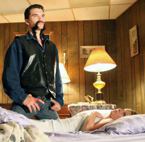 Ridiculously overgrown mustaches, uncontrollable diarrhea, kung fu, randomly placed film references, a killer vagina with dentures and fake male appendages a plenty are on display in Director, Ron Bonk’s latest film “She Kills”. It’s an homage to Exploitation and Grindhouse films of the 70’s. I just want to say thanks to Ron for giving me access to an online screener of the film prior to its official release, I really appreciate it. She Kills is a story about Sadie (played by Jennie Russo), a free-spirited young woman whose just gotten married to her sweetheart Edwin (Kirk LaSalle). Shortly after checking into their honeymoon suite at a local motel, Edwin is viciously murdered by a gang called “The Touchers” and Sadie is raped. The group are led by Dirk (Trey Harrison), a self-proclaimed ladies man sporting preposterously long facial hair. After Sadie is assaulted she discovers a dangerous secret about her body, she’s cursed with a condition called “fire crotch”. An exorcism of sorts gone wrong unleashes Satan’s control over her genitalia and all hell breaks loose in this blood soaked, bat shit crazy revenge flick. The film also stars Michael Merchant, Jody Pucello, David Royal, Martha Zempsta, Niecy Cerise, Mateo Prendergast and Matt Mendoza.