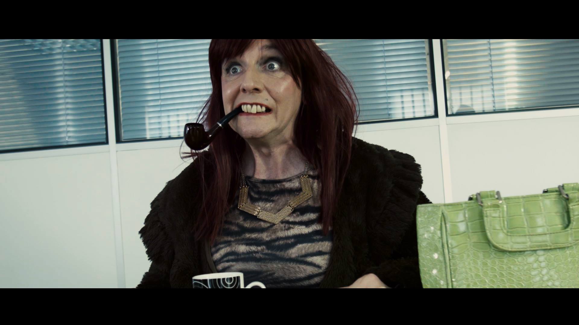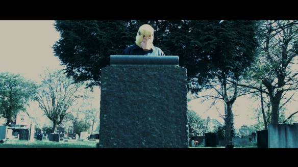 The Quacky Slasher presents with several different chapters, each introduced with a clever and entertaining anecdote in writing. My favourite is “Some time between 3:00 and 3:01” (haha) but the others are amusing too. Peter’s script plays far more as a comedy than a horror, and although I’d have preferred the latter, most of the humor does work. Think Edgar Wright’s, “Hot Fuzz” when it comes to our dogged detective pairing and then 90’s TV comedy, “Keeping Up Appearances” during the scenes where Michael’s mother (also played by Gallagher) answers questions from police. The delivery is contrasting, because while it’s quite over the top, the material is actually rather dry. Mrs Quackers (who can be seen in the image below), along with the two detectives, are definitely the funniest parts about The Quacky Slasher. Gallagher actually plays three roles in the film, the concerned “cockney” mother being the best of the bunch. He dons a long wig, a pipe and some extremely crooked teeth that see him talking like he’s got gigantic dentures in, it’s hilarious. There’s a straight forward but priceless line said to her son that goes something like “You’re just a mental in a duck mask”. The opening sequence with creepy store owner, Farraday (Finney) is good for a laugh and once the banter between Detectives, Dampsy and Mantelpiece (Kinsella and Mercer) begins, it gets even better. McKiernon utilizes some practical blood spray amidst a couple of the kills and even generates a decapitation, notwithstanding the lack of punch.