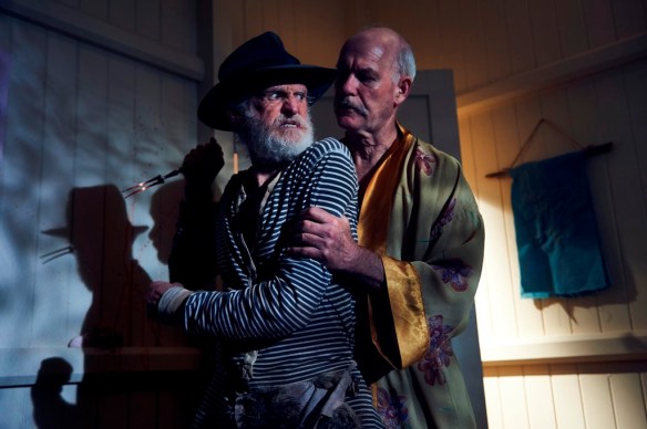 Most of the minor gripes I had with Two Heads Creek weren’t to do with anything shown on-screen, but more a couple of missed opportunities with things that weren’t fully taken advantage of, i.e. the cricket bat and boomerang. They’re both examples of two very “aussie” items that unfortunately weren’t quite used in the way I thought they were going to be. Someone is hit with a bat but not in the way I’d hoped for, and what’s more is there wasn’t a cricket themed one-liner to accompany it (this being the exact type of movie to do something like that). Same goes for the boomerang. Toward the end of the film we’re clearly shown that it has spikes through it that would no doubt do some damage, yet the kill that we see it used in is depicted in a wide shot and nowhere near as memorable or gory as it rightly should’ve been. I also noticed a couple of glimpses of what were clearly fake props on display during the big fight. From a creative license point of view I didn’t love the decision to burden Gary Sweet with a German accent. It comes across as uneasy for him, resulting in a few patchy scenes. The musical number was another choice that clashed a bit with the idea of the “Australia Day Feast”.