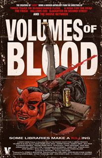 Firstly I’d just like say thanks to Writer and Director, P.J Starks for sending me the hard copy, screener for a new Horror Anthology film called “Volumes Of Blood”. P.J is just one of five directors, and three writers that played a part in making Volumes Of Blood. He also has a part (playing himself) in the last act of the film. Volumes Of Blood tells the story of a sociology student, who gathers a group of his friends at the local library on Halloween night. He’s been assigned the task of creating a new urban legend, so the group of 4 each tell their best story. Tyler (Jason Crowe) is the first to tell a story. His is about Lilly, a young student cramming research in late one night at the library. After having some difficulty focusing on her work, she’s approached by a charming stranger who offers her a mysterious energy drink that has surprising results. Kaelin (Roni Jonah) the girl in the foursome, tells a paranormal based story. What starts out as a normal night for a young librarian, turns out to be anything but after experiencing a classic haunting. Reece (Garrett Smith), is the movie buff of the group who tells a tale of a young film student named Sidney, played by Paige Ward (yes one of the several Scream references haha). Sidney has been given permission to work late in the library, and after a surprise visit by her boyfriend (No his name isn’t Billy…) she’s left alone to fend off a mysterious figure. Lastly Bryan (Gerrimy Keiffer) who is responsible for the groups gathering, tells the tale of Paige (Kristine Farley), a young librarian dealing with the guilt of her late, ex-boyfriend Derek (Kevin Roach) having committed suicide. A book of the devil comes into play and she must face her own demons. The film also stars Jim O’Rear, Jakob Bilinski and P.J Starks.