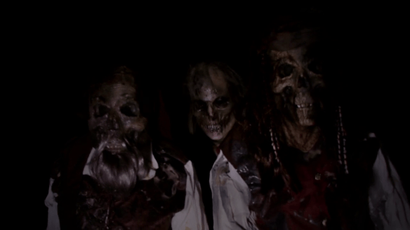 Steve’s script definitely isn’t lacking exposition regarding the origins of Captain Lassard. Early in the film Grant gives Linda what can only be described as a sermon, going into all sorts of specifics about how and why the ancient treasure exists etc. I think with a title such as this one, more people than not aren’t going to place much importance on how and why the films scenario came to be. I’m usually a stickler for details and looking to see if things are explained properly, but even I found it difficult to care much about the semantics and was much more about the conflict. The performances are about what you’d expect in a micro-budget film, some passable, and some not as much. J.C’s historian like approach fits his mysterious character, not to mention he looks the part as well. Powers as the Detective, gets his fair share of dialogue but his interactions with French often feel rigid. French is left to carry the film and although she’s serviceable, I’ve seen her do better work. On the effects front, there’s a few cuts to shots of a practical pirate ship and I’m stumped as to how they were done. One would have to assume it was with miniatures, either way it’s a real highlight. Say what you want about cheap costumes, but in the case of Zombie Pirates they actually look alright with a careful course of lighting. On a down note, it’s almost a 35 minute wait before we get to see them. I have to commend Sessions for getting a limb or two made for the film, as well as a practically fashioned head. He even threw a few maggots in with the blood, it’s not much in the way of gore but it counts for something (or should).